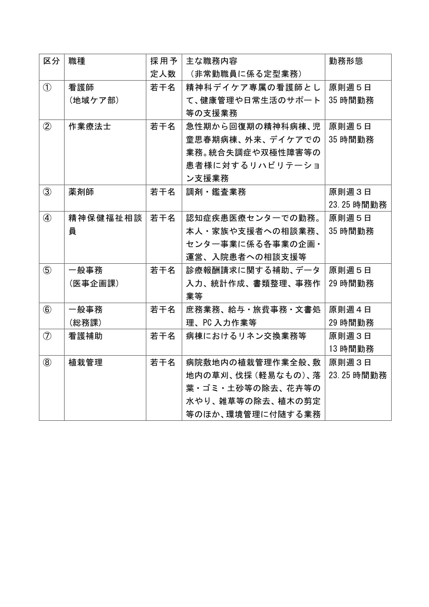 ・募集区分①②:週35時間(原則7時間×週5日)
